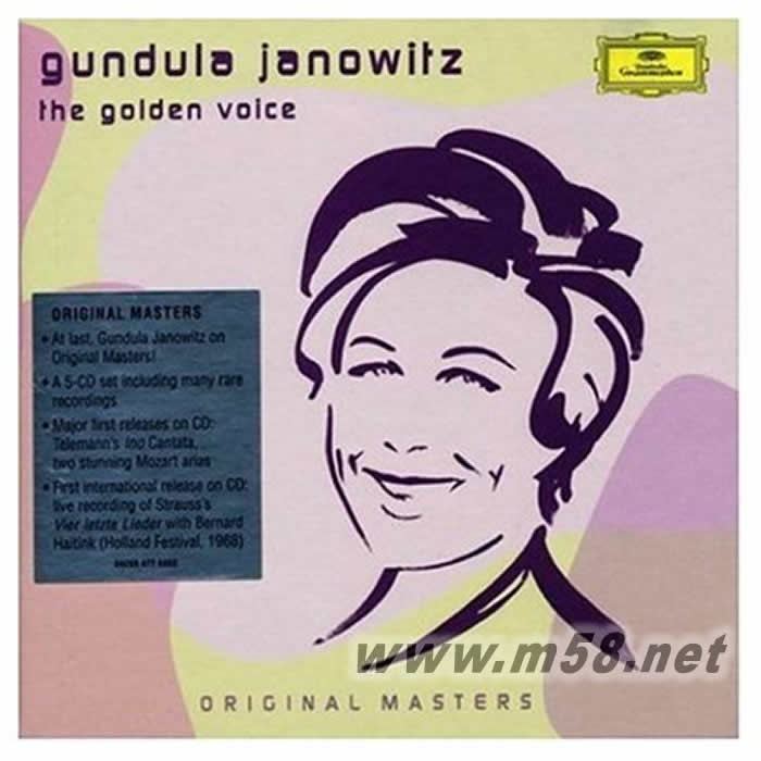 价格为估,以实到货为准! Golden Voice 黄金之声 盒装五CD(m58.net) 这款《黄金之声》由DG唱片公司发行于2006年,内收录了德国女高音昆杜拉•雅诺维茨演唱生涯的一些珍贵录音。 这可以说是一套久违的雅诺维茨个人专辑,除了雅诺维茨个人颇受好评的歌剧咏叹调(特别是莫札特的作品)与音乐会曲目,还有首度以CD型式发行的泰勒曼清唱剧。值得一提的是,理查•史特劳斯《四首最后的歌》是雅诺维茨于1968年与海汀克及阿姆斯特丹大会堂管弦乐团在荷兰音乐节上的实况录音,过去只在荷兰发行过,而这个版本一般认为比雅诺维茨与卡拉扬的版本更杰出。 “Original Masters”大师原版系列,都是以最简单的包装、最实惠的价格,将大师原版一次性打包推出的多碟套装系列。大师原版系列收录的都是当年经典录音的原版母带,所以相当珍贵。此系列作为特价套装,除了包装比较简单节省外,唱片全部与普通版一样,同样是德国压片,品质相当好。 德国女高音昆杜拉•雅诺维茨(Gundula Janowitz)于1937年生于德国柏林,在格拉茨接受音乐教育,1959年首次在维也纳国立歌剧院演唱莫札特《费加洛婚礼》,后在维也纳国立歌剧院演唱长达30年,特别擅长莫札特与理查•史特劳斯的作品,1960年到1962年在拜鲁特音乐节演出华格纳《帕西法尔》,1968年首度在萨尔兹堡音乐节上演唱莫札特《唐乔望尼》,后固定在纽约大都会歌剧院、英国柯芬园等著名歌剧院演出。除了歌剧,雅诺维茨也擅长演出艺术歌曲。